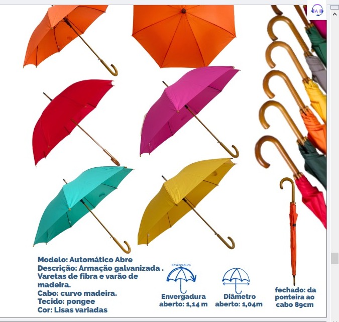 Guarda-Chuva Automático Personalizado 1,20 cm de Cobertura Confeccionado em tecido Pongee, armação galvanizada, cabo curvo e varão em madeira, Cores disponíveis: Amarelo, Azul, Branco, Laranja, Preto, Rosa, Verde, Verde Escuro, Verde Musgoo, Vinho, Marrom e Vermelho Dimensões aberto: 89,0 x 97 cm com 120,0 CM de envergadura