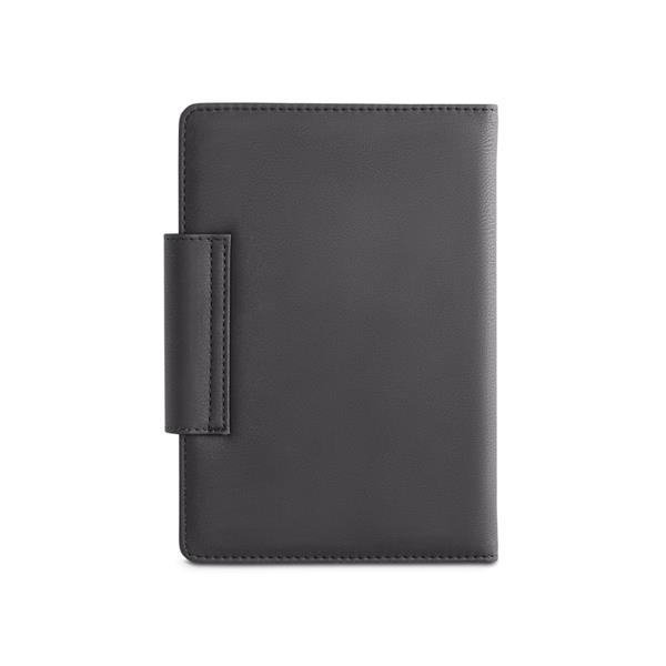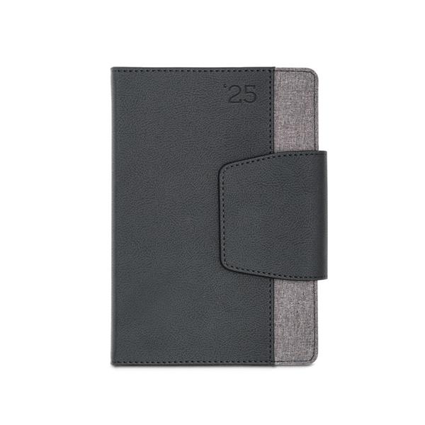 Agenda bi-material A5 em couro sintético e tecido em poliéster. Agenda com fecho magnético, bolso frontal e suporte para esferográfica. Fornecida com bolsa de non-woven. Esferográfica inclusa - escrita azul. • Medida: 14,8x21cm - Agenda | 148 x 210 mm | 20,5x25cm - Bolsa • Medida aproximada para personalização: 7,0~8,5x5,5~16cm - Frente/Verso Agenda | 5,0~5,5x0,6~0,7 - Corpo/Caneta metal • Peso(g): • Cores disponíveis: Azul e Cinza