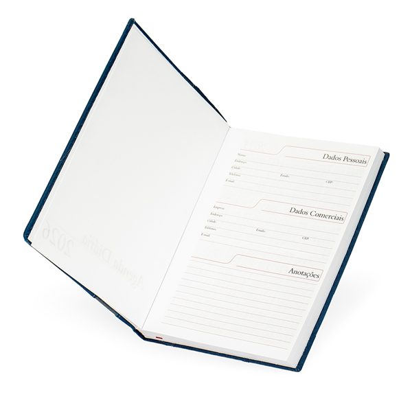 Agenda diária 2024 de couro sintético com suporte para caneta. Contém fita de cetim marca página, dados pessoais, calendário de 2023 à 2025, mapa do Brasil, mapa-múndi, índice telefônico e planejamento. Não acompanha caneta. Caixa opcional. • Medida: 20x14,9cm • Peso(g): 385g • Cores disponíveis: Azul, Marrom e Preto