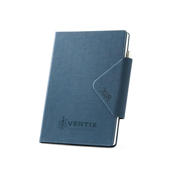 Agenda A5 em PU com fecho magnético. Está organizada num plano diário. Com suporte para esferográfica (incluída) e marcador em fita. Fornecida com bolsa de non-woven. Medida:14,8x21cm | Bolsa: 20,5x25cm Peso(g): 506g Cores disponíveis: Azul
