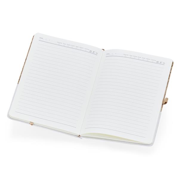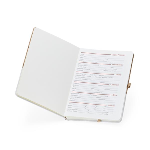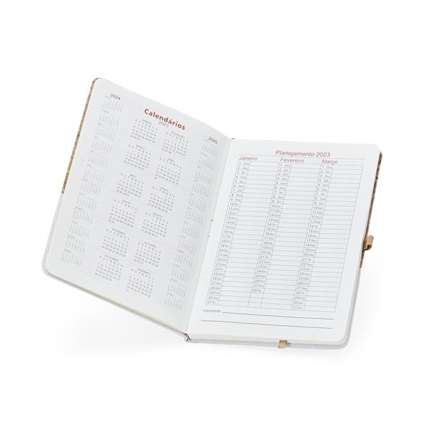 Caderneta A5 de cortiça com detalhe em linho e suporte para caneta, contém marcador de página em cetim, página para dados pessoais, calendário 2023 a 2025, páginas de planejamento e aproximadamente 93 folhas marfim com pauta. * Medidas: Altura: 21,1cm | Largura: 14,3cm | Espessura: 1,4cm * Peso aproximado (g): 270G * Cores Disponíveis: Azul, Branco, Marrom, Preto, Roxo, Verde e Vermelho