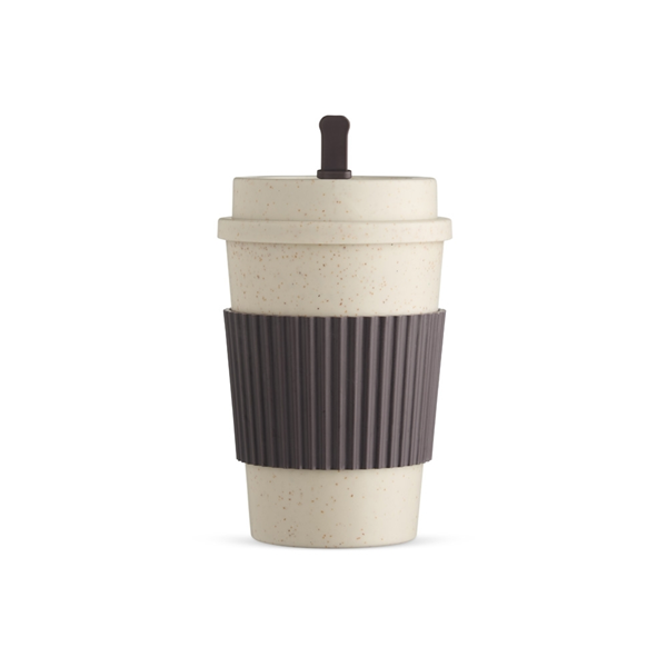 Copo de Fibra de Trigo com capacidade de 450ml, tampa rosqueável. Incluso mexedor e manta protetora. Altura : 13,9 cm Largura : 8,2 cm Circunferência : 26 cm Medidas aproximadas para gravação (CxL): 1,5 cm x 4 cm Peso aproximado (g): 90