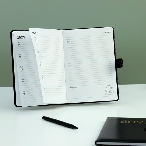 Agenda diária 2026 produzida em couro PU com fecho magnético. Contém folhas para dados pessoais, calendários 2026 à 2028 e planejamento 2026. Obs: Não acompanha caneta. Altura: 21,2cm Largura: 15,2cm Espessura: 1,7cm Peso aproximado (g): 198
