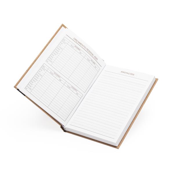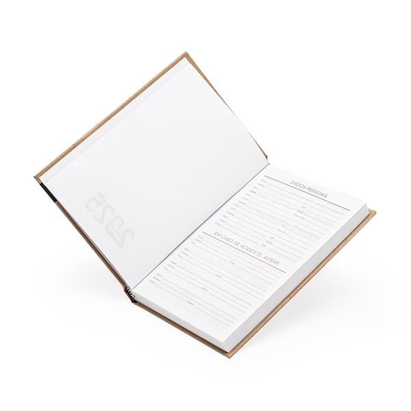 Comece o ano de forma ordenada e planejada com nossa Agenda Diária 2025. Feita em kraft, ela combina simplicidade com um toque de elegância natural. Possui espaço para dados pessoais, calendário de 2024 a 2026, planejamento mensal e espaço dedicado aos aniversariantes importantes. Altura: 20,6cm Largura: 14,1cm Espessura: 2cm Medidas aproximadas para gravação (CxL): 17 cm x 9cm Peso aproximado (g): 408