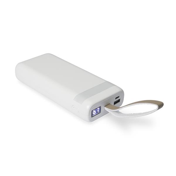 Um carregador portátil em plástico com capacidade de 20.000mAh, ideal para energizar smartphones, tablets e outros dispositivos compatíveis. O power bank apresenta quatro cabos diferentes com saídas para conexões: Lightning, USB-C, Micro-USB e USB. Conta ainda com duas entradas, uma USB-A e outra USB-C, painel de LED numérico e lanterna frontal e alça fixa em couro sintético para transporte. Acompanha cabo USB-C. Altura: 15cm Largura: 6,8cm Espessura: 3cm Peso aproximado (g): 418 Cores disponíveis: BRANCO, PRETO