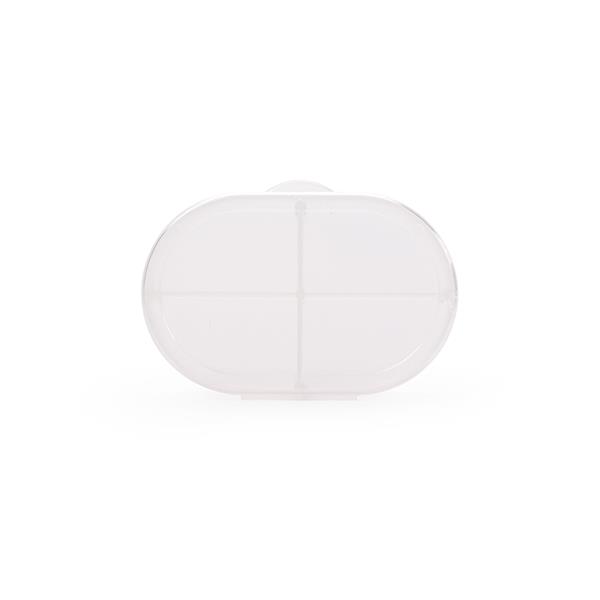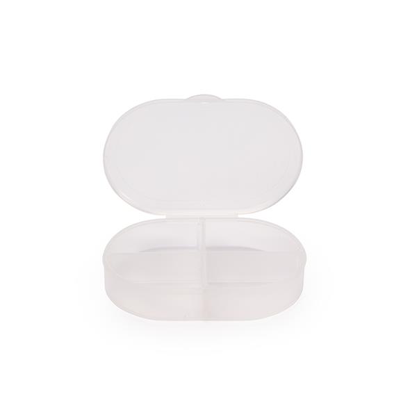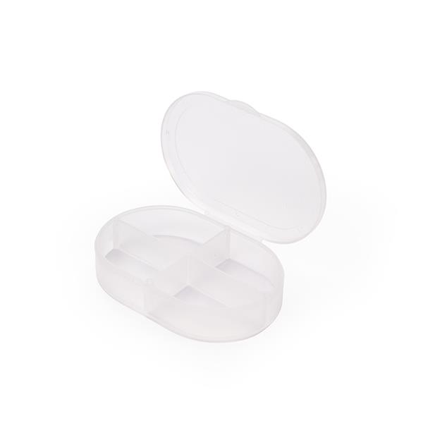 Um porta-comprimidos compacto feito em plástico. Possui quatro divisórias que oferecem mais possibilidades para organizar medicamentos ou pequenos objetos. Largura: 4,8cm Espessura: 0,5cm Comprimento: 6,8cm Peso aproximado (g): 9