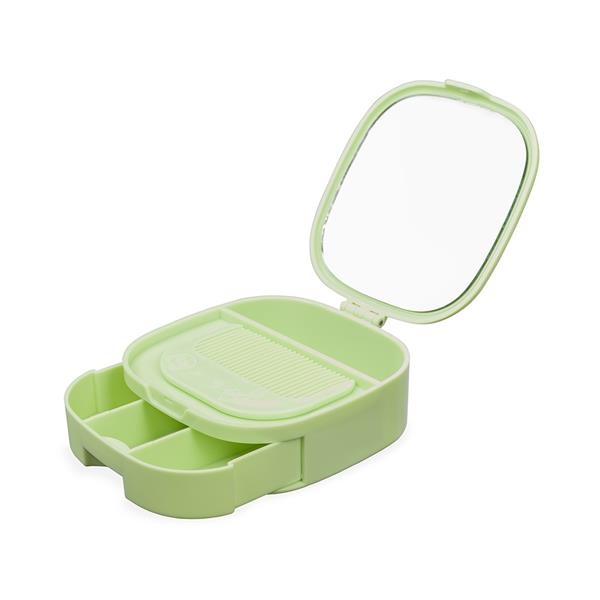 Este porta-joias feito em plástico é uma ótima opção para guardar objetos delicados com segurança. O organizador conta com espaço interno com dois compartimentos de tamanhos distintos e uma gaveta com três divisórias. Além disso, possui um espelho na parte interna da tampa, o que destaca sua versatilidade. Acompanha um pente compacto. Altura: 3,5cm Largura: 9,9cm Comprimento: 9,9cm Peso aproximado (g): 133 CREME ROSA VERDE