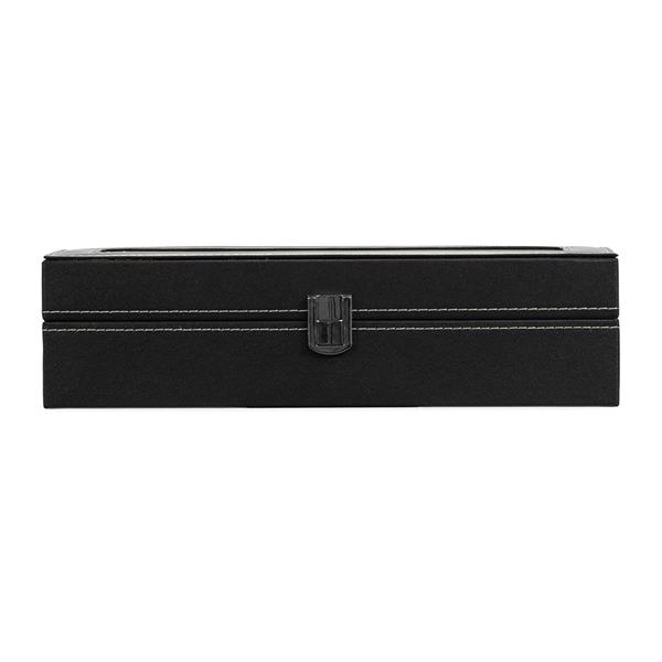 Este é um porta-relógios com acabamento refinado em couro sintético à base de PVC. Ele possui revestimento interno em veludo e seis divisórias com almofadas removíveis, além de visor de vidro na tampa e abertura em 90 graus para melhor visualização e manuseio dos acessórios em seu interior. Também apresenta trava de segurança para fechamento do estojo. Altura: 8cm Profundidade: 11cm Comprimento: 30cm Peso aproximado (g): 619