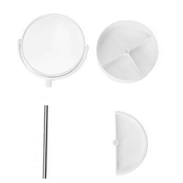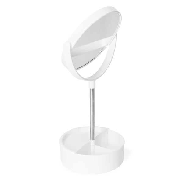 Espelho de mesa dupla face giratório com design moderno e funcional. Com base e moldura de plástico e pedestal de alumínio, ele é fácil de montar e adequa-se bem a qualquer ambiente. Sua base contém três divisórias para guardar objetos diversos. Altura: 34,5cm Largura: 14,5cm Peso aproximado (g): 275 Cores disponivéis: BRANCO, ROSA