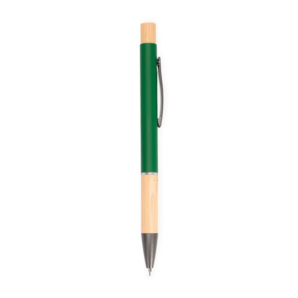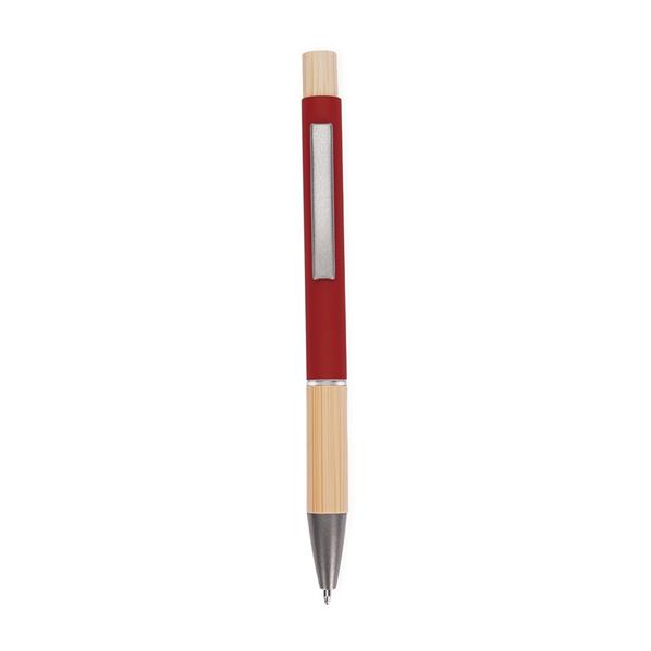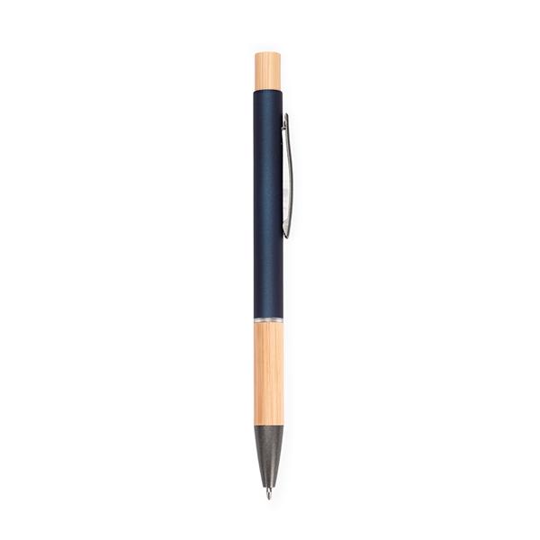 Caneta com carga esferográfica azul de 1.0mm. Apresenta corpo metálico, detalhes em bambu e acionamento por clique, oferecendo uma pegada leve para uma escrita precisa. Largura: 1,3cm Comprimento: 14cm Peso aproximado (g): 12 Cores disponíveis: AZUL ESCURO, BRANCOm LARANJA, PRETO, ROSA, VERDE CLARO, VERDE ESCURO, VERMELHO