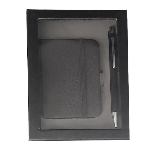 Bloco de anotações capa dura em couro sintético 7,5 x 10,5 x 1,4 cm, com elástico para fechamento, 80 folhas amarelas sem pauta, marca página de cetim da cor do bloco, Caneta cilíndrica em metal com acabamento brilhante e detalhes cromados e acionamento por clique. 13,6cm de altura e 0,9cm diametro Caixa: 2,8 x 12 x 16,8cm Dimensões | 16,8 x 12 x 2,8cm
