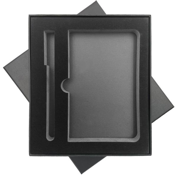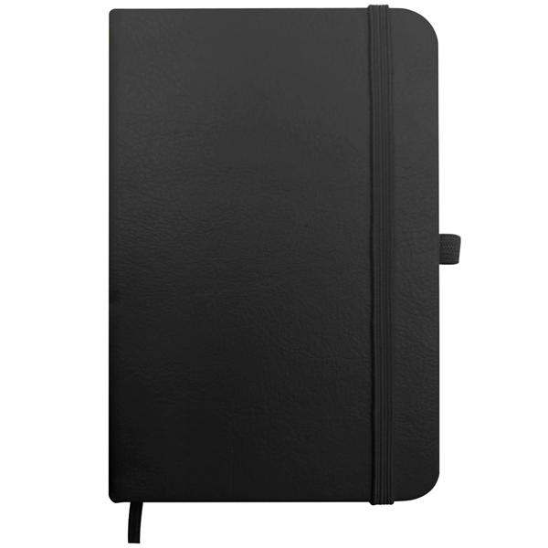 Bloco de anotações 9x14 cm capa dura em couro sintético, com elástico para fechamento e para prender a caneta, 80 folhas amarelas com pauta, marca página de cetim da cor do bloco. Caneta cilíndrica em metal com acabamento preto brilhante, com detalhes cromados, com carga da cor azul e com acionamento giratório+ Caixa em papel cartão, com espaço para caneta e bloco de notas, com acabamento aveludado. Dimensões | 17 x 15,2 x 2,6cm Peso (gm) | 228 Cor | Preto, Preto e Prata