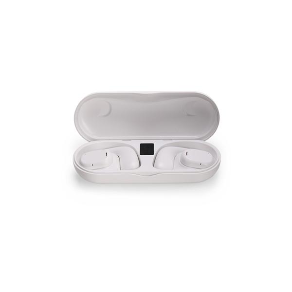 Fones de ouvido sem fio com estrutura em plástico. Possuem formato aberto e ergonômico, permitindo o encaixe nas orelhas sem entrar em contato direto com o canal auditivo. Apresenta conexão via Bluetooth 5.3 que oferece uma transmissão de dados mais estável e com maior qualidade. Acompanha estojo de carregamento com visor de percentual da carga total, além de cabo USB-C para recarga. Altura: 5cm Espessura: 3cm Comprimento: 13,5cm Peso aproximado (g): 89 Cores disponíveis: BRANCO, PRETO