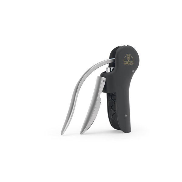 LAGREIN. Saca-rolhas em ABS e zinco com alavanca automática para abertura fácil Saca-rolhas em ABS e zinco, com acabamentos em borracha. Devido à sua alavanca automática permite-lhe remover com facilidade e em poucos movimentos qualquer rolha de garrafa. Um aliado para quem gosta de vinhos. Fornecido em caixa presente. 128 x 150 x 40 mm