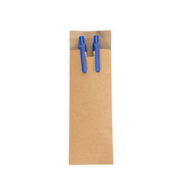 Kit de caneta e lapiseira ecológicos com estojo em papelão. A caneta possui corpo em papelão com ponta, clipe e acionamento por clique em plástico, além de carga esferográfica azul de 1,0 mm. A lapiseira segue o mesmo design, equipada com mina de grafite de 0,7 mm. Largura: 5,4cm Espessura: 1,3 cm Comprimento: 17,2cm Peso aproximado (g): 16 Cores disponíveis: AZUL, PRETO