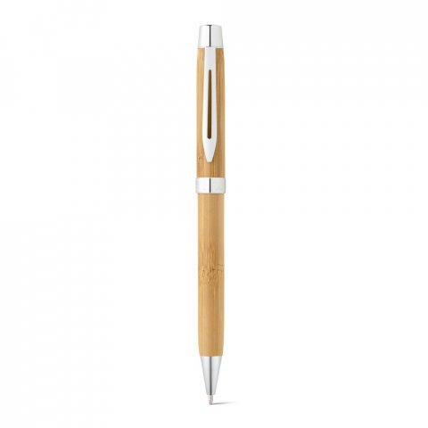 Esferográfica em bambu com clipe de metal. A esferográfica tem mecanismo twist e escrita em azul até 1,5 km. Fornecida numa caixa presente em bambu com tampa deslizante e capa em papel 100% reciclado. A cor e o resultado da impressão nos materiais naturais pode variar entre produtos. 24 x 152 x 23 mm