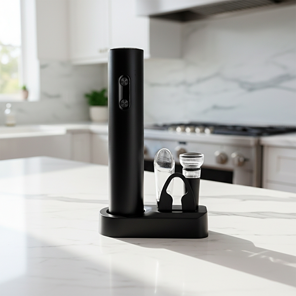 Kit vinho com cinco peças, incluindo: saca-rolhas em plástico e aço carbono com acionamento por botões alimentado por quatro pilhas AA (não inclusas), bico dosador e rolha em plástico e borracha TPR, cortador de lacre e base em plástico. Altura: 22,5cm Largura: 4,5cm Circunferência: 14cmN Peso aproximado (g): 376