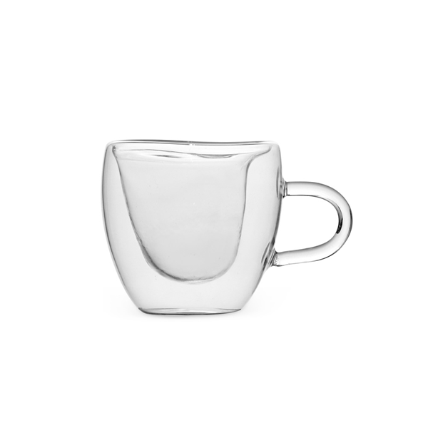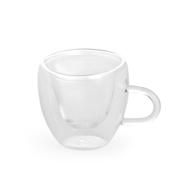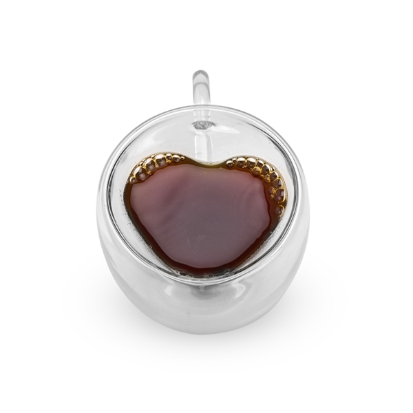Xícara de vidro com capacidade para até 80ml. Possui contorno interno em formato de coração e estrutura de parede dupla que ajuda a impedir que a temperatura de líquidos entre em contato com a parte externa. Altura: 6,2cm Largura: 9,7cm Circunferência: 21,5cm Peso aproximado (g): 60