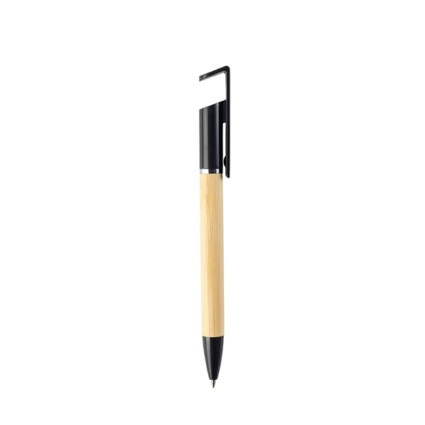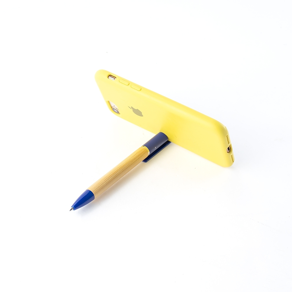 Caneta em bambu com ponta e ponteira com suporte para celular em plástico, acionamento por rotação e carga esferográfica azul de 1.0mm. Altura: 14,7cm Largura: 1,5cm Peso aproximado (g): 9 Cores disponíveis: AZUL, BEGE, PRETO