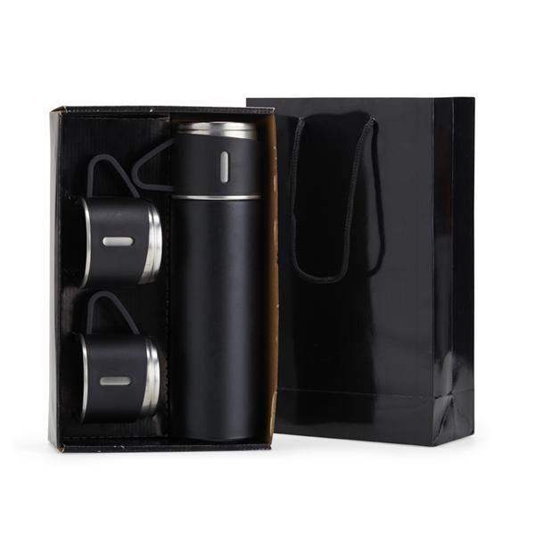 Kit Garrafa de Inox Térmica 450ml com 03 tampas de Café Kit garrafa térmica 450ml com duas tampas extras que podem ser utilizadas como xícaras. Garrafa produzida em inox com base antiderrapante e tampas de inox com revestimento plástico. Acompanha sacola de papel com berço de papelão para acomodação das peças. Altura: 25,5 cm Largura: 16 cm Profundidade: 7,2 cm Medidas aproximadas para gravação (CxL): Embalagem 19 cm x 15,5 cm Peso aproximado (g): 354 Cores disponíveis: Azul, Cinza, Inox, Preto, Rosa e Verde