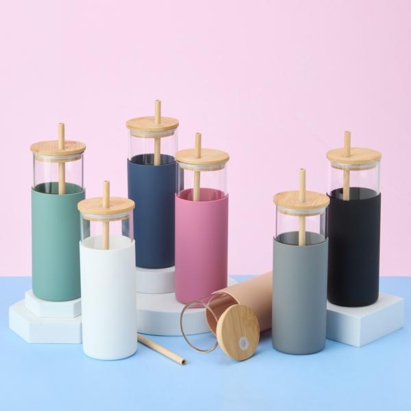 Copo de vidro borossilicato com capa protetora de silicone, tampa de Bambu e...