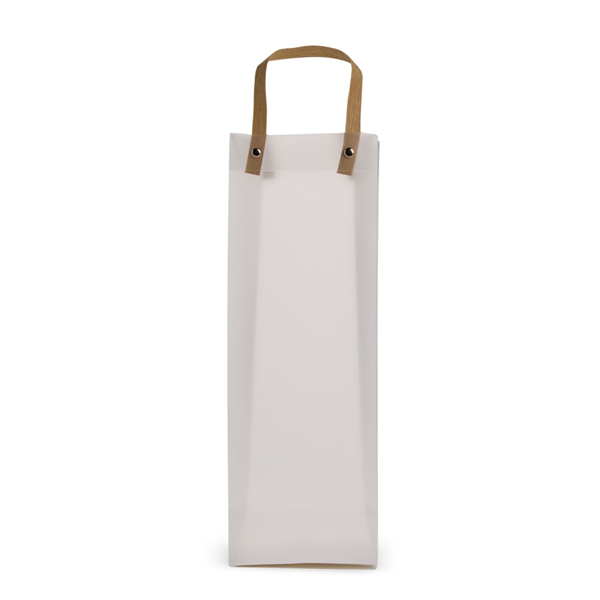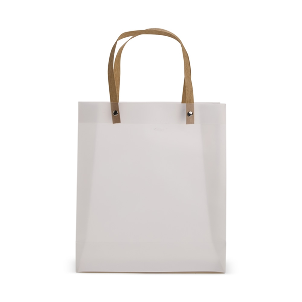Sacola plástica com formato retangular, acabamento fosco e alças em papelão...