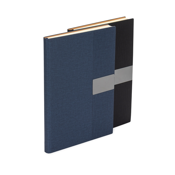 Caderneta em capa com acabamento em tecido de algodão, plaquinha metálica...