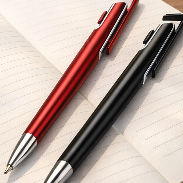 Caneta plástica com ponta metálica, acionamento por clique e abertura que...