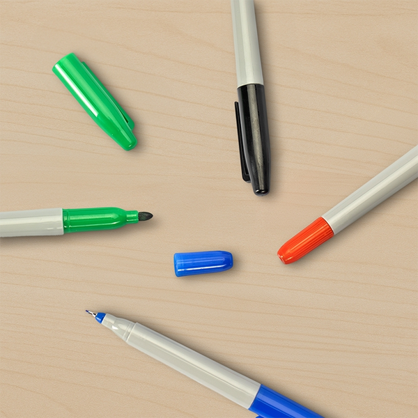 Caneta marcadora plástica com duas pontas em formatos diferentes: uma fina e...