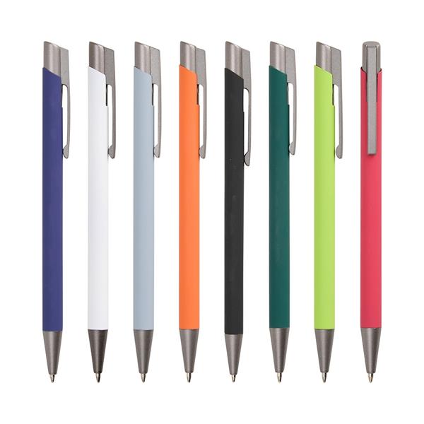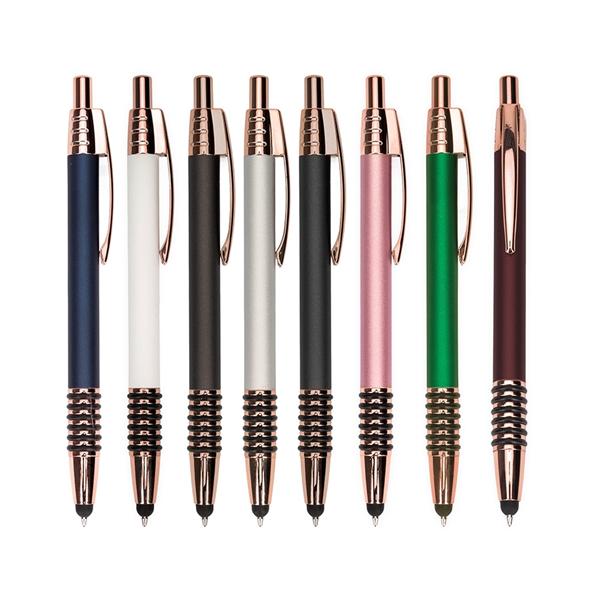 Caneta touch screen em metal com acabamento similar à borracha. Acionamento...