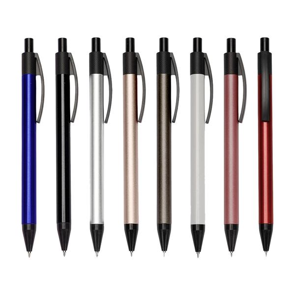 Caneta de corpo metálico, ponteira e clip em plástico e acionamento por...